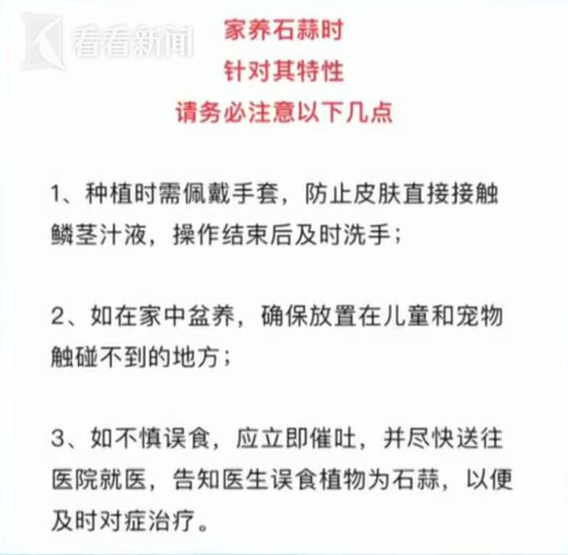 石蒜花还有一个神秘又诗意的名字:曼珠沙华,其性辛、温,有毒。误食可导致恶心、呕吐、腹痛、腹泻,严重时伴随头晕、肢体麻木,甚至呼吸困难;皮肤接触其汁液后,可能出现红肿、瘙痒。如果家养石蒜花时,针对其特性,种植时需佩戴手套,防止皮肤直接接触鳞茎汁液,操作结束后及时洗手;如在家中盆养,确保放置在儿童和宠物触碰不到的地方;如不慎误食,应立即催吐,并尽快送往医院就医,告知医生误食植物为石蒜花,以便及时对症治疗。